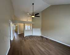 Step inside to a bright living room with vaulted ceiling, ceiling fan, and open flow into the dining area. The kitchen features a cozy eat-in space and comes equipped with a stove, refrigerator, and dishwasher. A bonus room provides extra convenience with a full-size washer and dryer included.