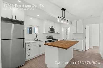 - Kitchen with new countertops, tile, and stainless appliances
