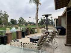 Enjoy fabulous fairway, water, and mountain views from the extended patio of this beautifully remodeled 200 Max Plan boasting 2 bedrooms and 2 baths. With spacious living areas and a vaulted ceiling in the living room, this condo exudes an open and inviting atmosphere. A cozy gas fireplace adds warmth, while custom window coverings and stunning mid-century furnishings create a sophisticated yet comfortable aesthetic. The converted atrium provides additional living space, perfect for relaxation or entertaining. Located just steps away from the community pool and spa, this is the ideal vacation retreat. Call now to reserve your beautiful getaway!