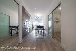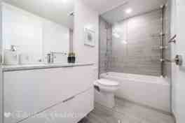 This 1 bedroom + den suite features designer kitchen cabinetry with stainless steel appliances, stone countertops, under cabinet lighting and an undermount sink. Bright floor to ceiling windows with laminate flooring throughout facing lake views from the large private balcony. A spacious sized bedroom with a sliding door, mirrored closet and lake views. The separate enclosed den is perfect for a home office.