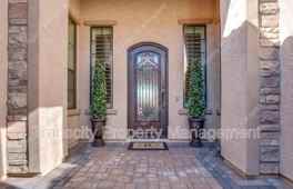 One of Mountain Bridge's Finest homes-- IMMACULATE 3BR + Bonus Room, 3.5 BA, 3 car garage. Customized designer home. North/South PREMIUM corner lot. City light, sunset & mountain views. Resort-like backyard with a stunning pool with rock waterfall, built-in BBQ, sink, and granite counter. Pavers and hardscape, turf & huge covered patio designed for entertaining enjoyment.. Elegant courtyard entry with gas fireplace. Impressive iron front door. Gourmet kitchen, upgraded cabinets, new Taj Mahal Quartzite counters, large island, walk-in pantry, upgraded appliances & custom backsplash - all open to the beautiful dining area and great room. Gorgeous owner's suite with patio access, 2 closets, soaking tub, and rain shower. Amazing bonus room with wood tile floors & separate entrance from the courtyard! The home can be rented partially furnished.