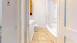 One distinctive room showcases warm wood paneling on the lower half of the walls, introducing a rustic element to the home's overall design. The bathroom, while compact, offers modern fixtures including a vanity and a bathtub-shower combination.