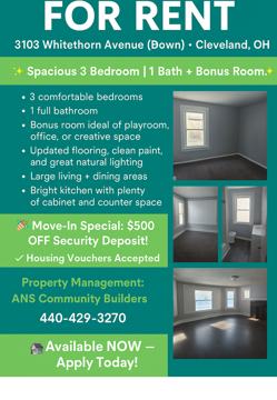 📍 FOR RENT – 8103 Whitethorn Avenue (Down) • Cleveland, OH ✨ Spacious 3 Bedroom | 1 Bath + Bonus Room ✨ A newly updated downstairs unit featuring: ✔ 3 comfortable bedrooms ✔ 1 full bathroom ✔ Bonus room perfect for a playroom, office, or extra storage ✔ Fresh paint, updated flooring, and plenty of natural light ✔ Large living + dining areas ✔ Clean, bright kitchen with good cabinet space 🎉 Move-In Special: $500 OFF Security Deposit! ✔ Housing Vouchers Accepted
