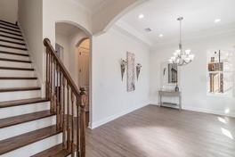 Interior finishes include quartz countertops, wood cabinetry with soft-close doors and drawers, stainless steel appliances, engineered hardwood flooring, and high ceilings throughout. The primary suite offers generous space with a large bathroom featuring a soaking tub, separate shower, and walk-in closets.