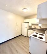 -Cozy Interiors - LVP flooring in kitchen and bath, carpet in living area and bedrooms, freshly painted, and kitchen complete with refrigerator and oven/stove.