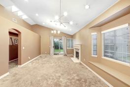 The bright living room includes skylights, recessed lighting, a ceiling fan, and a charming custom tile fireplace with a decorative mantel, creating a warm and welcoming atmosphere. The kitchen offers wooden cabinetry, plenty of storage space, and essential appliances including a stove, refrigerator, microwave, and dishwasher.