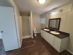 Our home #13, Three bedroom/Two bath manufactured home featuring a large kitchen, dining and living area, vaulted ceilings, large master bedroom and bath suite, stand-alone shower and garden tub, resilient oak colored vinyl flooring, central heat & air conditioning system, dishwasher and washer/dryer connections.