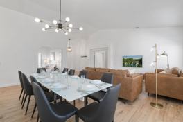 The living and family rooms include a cozy fireplace, while the updated kitchen offers white cabinets, stainless appliances, and upgraded counters. The private primary suite includes a walk-in closet and ensuite bath, set apart from the guest rooms. One guest room has bunk beds with a trundle (sleeps 4). Large windows bring in natural light, and the backyard is great for desert living—featuring a heated Pebble Tec pool (heating fee applies), raised spa, fire pit, shaded patio, and lounge chairs. Enjoy HD TVs, cable, fast mesh Wi-Fi, and central AC. Guests have full access. A Ring doorbell and backyard camera are in place (no indoor cameras).