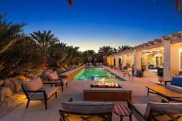 Welcome to Villa Barhi! This unique Mediterranean Palazzo offers a glorious reimagined outdoor space and awaits your enjoyment. Refresh in our oversized saltwater pool - complete with spa, waterfalls, and an in-water lounge area. After your swim, soak up the sun in one the numerous lounge areas, or grab a book and stay shaded in our expansive covered patio. After being mesmerized by the stunning sunset over the San Jacinto mountains, all those outdoor spaces transform into your personal stargazing basecamp. Light a fire, pour a glass of wine, and enjoy the cool desert nights! The spacious interior features a gourmet kitchen, multiple dining and living areas, fireplace and a private office. Sleeping arrangements include 4 bedrooms and 3.5 baths with a generously sized primary suite featuring a California King Sleep Number bed, Jacuzzi tub, shower with body sprays, dual vanities, and a huge walk-in closet. The junior primary suite offers a standard king Sleep Number bed, ensuite bath and walk-in closet; while the remaining bedrooms feature queen beds and share a Jack n Jill bath with dual vanities. Located 20 minutes from downtown Palm Springs, with easy access to the Coachella Music Festival, the new Acrisure Arena and all our desert playground has to offer. Our horse corral accommodates up to 6 horses and your dog is welcome too! This perfect home has all the amenities you are looking for with the added benefit of tranquility and serenity. Inquire for rates & availability