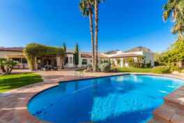 This FULLY-FURNISHED LUXURIOUS Home in PARADISE VALLEY, in the heart of Scottsdale, is a BEAUTIFULLY detailed, authentic Santa Barbara/Hacienda home designed for family living with SALTILLO tile throughout. A gated courtyard entrance leads into this GORGEOUS home that includes 6 STUNNING bedrooms en suite w/King and Queen size beds in this split floor plan. The bathrooms are detailed w/AMAZING tile work in the 7 bathrooms; and a CHARMING Guest House with a partial kitchen and laundry for those family/friend guests. The Chef’s kitchen features WOLFE/SUB ZERO and opens to a casual dining area. Large butler’s pantry and walk-in WINE CELLAR. The RESORT STYLE backyard has STUNNING mountain views from the pool area. A second to none backyard eating and cooking area with GRILL, PIZZA OVEN, SINK, FRIG, GRIDDLE and WOK RANGE with covered seating.