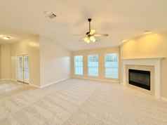 Enter through the elegant double archways leading to the great room with vaulted ceiling, corner fireplace, and views of the private backyard. The large, open kitchen is the heart of this home, featuring Corian countertops, a center island, breakfast bar, walk-in pantry, and stainless steel appliances including a refrigerator, flat top range/oven, built-in microwave, and dishwasher.