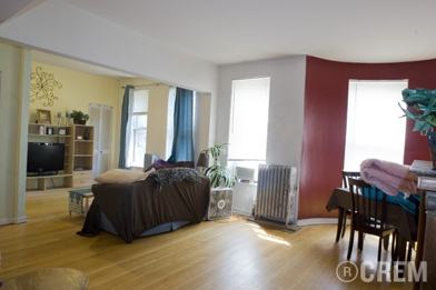 Big, open living room and turret dining room. Separate tv/office area. Larger bedrooms with big closets. Both fit queen or king beds plus dressers. Small rear deck area.