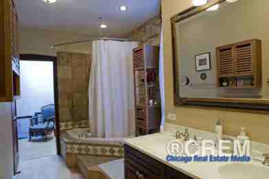 Great updated bathroom with double-bowl sink and whirlpool tub.