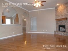 Located in the Knights Ridge Neighborhood this beautiful home sits on a corner lot. At just under 2000 sq. ft. this home offers 4 bedrooms, 2 baths, a large dining area, and a spacious living room. The kitchen overlooks the living area and provides plenty of room, cabinet space, tile flooring, and easy access to the dining area, pantry, and garage. The living room is airy with a high ceiling, wood flooring, ceiling fan, and fireplace. The dining area will hold a large table and is great for family dinners and hosting guests. The master bedroom will accommodate bedroom furniture sets and the master bath includes a dual sink vanity, jetted tub, his and her closets, and a separate shower. The minor bedrooms are comfortable with ceiling fans, carpeting, and closet space. The enclosed patio extends the living space and provides a large area for a play area, entertaining guests, etc. Outside the property includes a sprinkler system, wood privacy fence, storage building, and a covered patio that is perfect for a grill. This property accepts pets