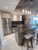 • Open concept kitchen has a large island, stainless steel appliances (stove, fridge, dishwasher, microwave, hood fan) and newly renovated porcelain tile flooring