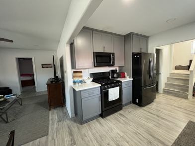 Modern kitchen with Samsung stainless steel appliances and tons of cabinet space.