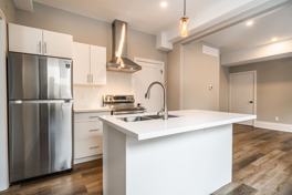 Spacious layout with full-sized stainless steel appliances: fridge, stove, and range hood