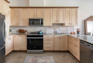 The multilayered hardwood flooring, plush carpeting, and ceramic tile kitchen floors offer a sophisticated and cohesive look, while the ceramic tile kitchen backsplash, granite countertops, and natural wood cabinetry complete the stunning kitchen.