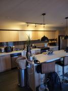 Kitchen boasts stainless appliances, deep modern undermount sink, quartz countertops, under cabinet lighting, and large island with bar seating. Wide plank hardwood flooring, tiles in bathrooms. Modern finishes, open concept, spacious unit