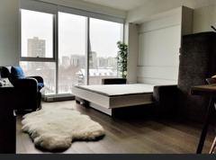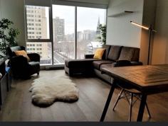 Beautiful furnished 470-sqft studio for rent in one of the most vibrant neighbourhoods of Montreal. Fully furnished, you just need to bring your own clothes! Close to all services, restaurants and universities, YUL building stands out for its class and futuristic design. The views from the lounge and the studio are simply breathtaking. The studio is located on the 10th floor with windows facing Rene-Levesque Blv and Mackay St, offering a stunning light all day.
