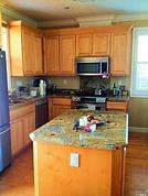 Modern eat-in kitchen has granite counters, stainless steel appliances, & access to private rear patio/garden