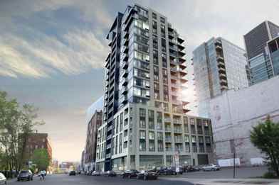 This unique and refined new condo is on the 9th floor and has a beautiful skyline of Montreal, offers one large closed bedroom + large walk-in closet, a spacious open space concept living-room, avant-garde bathroom and designer shower, front loading washer and dryer, a high-end European inspired kitchen fully equipped brand new appliances in stainless steel + lots of storage space and hydraulic cabinet doors, quartz counter top, and large windows facing south overlooking a beautiful balcony. Brand new espresso-colored maple wood floors in living-room and bedroom and kitchen, and Italian ceramic floor in the bathroom.