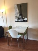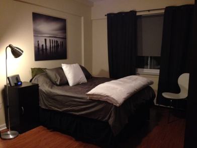 Large, bright one bedroom apartment on the 10th floor with balcony, great location downtown, very close to several grocery stores and lots of shopping, near St Catherine Street, 8 minute walk to Concordia University, 15 minute walk to McGill University, very quiet, large enough to share between 2 people, utilities all included, washer and dryer located on the same floor down the hall. Great for young couples, professionals and students.