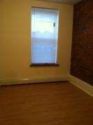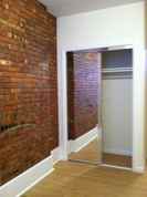 The bedroom has an exposed brick wall, a large window, a full closet, hardwood floors and enough space for a twin/full bed, desk and dresser.