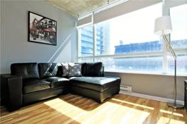 Tons Of Natural Light In This Modern Loft. 9 Ft Exposed Concrete Ceiling & Large Window Overlooking King St. Newer Flooring Throughout & Separate Bedroom W/ Very Big Closet. Super Clean & Ready To Move In! Only 10 Min Walk To Subway Station. 99 Walk Score, Mins From St. Lawrence Market, Distillery District, George Brown & Financial District. Easy Access To Dvp & Gardiner. Parking Spot Available for extra cost.