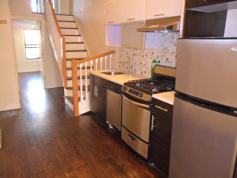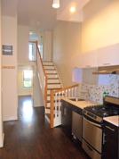 Hardwood floors, Exposed brick walls, stainless steel appliances with dishwasher.