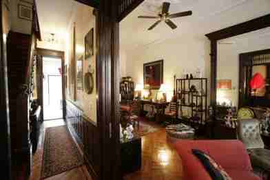 On the second floor you’ll find a master bathroom and two master bedrooms, both large enough to handle king sized bedroom furniture, each with a private dressing sink, separated by another lovely pocket door.