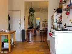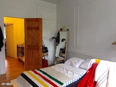This apartment has great features like high ceilings, original wide plank wood flooring throughout, and great natural light. There are two separate entrances so the space works easily as a two bedroom for roommates, or nicely as a one bedroom plus office for a couple seeking extra space.