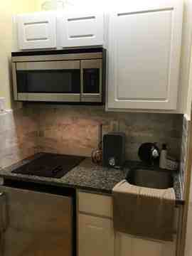Completed with modern kitchenette featuring granite counter, stainless steel microwave and fridge, and 2-burner stovetop. Bathroom completed with carrara marble and stall shower. Coin-operated laundry room in the building (elevator building).