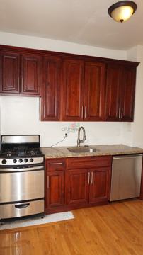 Renovated eat-in kitchen with window, stainless steel appliances, dishwasher, cherry wood cabinets, granite counter tops, hardwood floors and many closets.