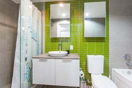 9ft concrete ceilings, lot's of light. Full shower, and a bath. In suite laundry.