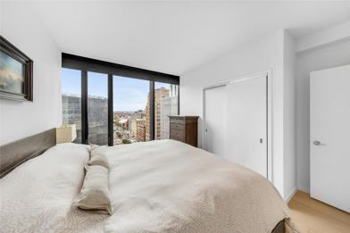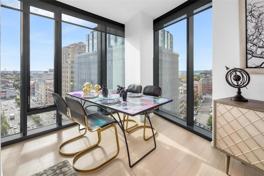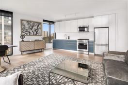Over sized soundproof windows in living areas and bedrooms create bright, peaceful interiors with dramatic city views. Open kitchens are designed with custom-built cabinets and stainless steel appliances.