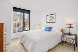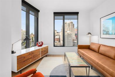 Oversized soundproof windows in living areas and bedrooms create bright, peaceful interiors with dramatic city views. Open kitchens are designed with custom-built cabinets and stainless steel appliances. Baths feature Italian porcelain tile paired with sleek Porcelanosa fixtures. All residences include custom solar window shades and Bosch washers and dryers.