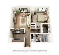 Offering 603 square feet of living space, this floor plan includes one bedroom and one bathroom, with a galley-style kitchen that leads directly into the living room. This apartment features a mix of hardwood-style flooring in the living area and carpeting in the bedroom, creating an environment that is both stylish and comfortable. Two hallway closets and a large bedroom closet provide ample storage space, augmented by the extensive Shaker-style cabinets in the kitchen. This apartment rents from $850 for remodel