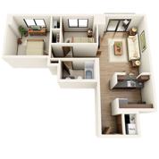 This spacious two-bedroom configuration offers 678 to 727 square feet of luxurious living space while maintaining an elegantly efficient design. The breakfast bar cutaway allows the kitchen to flow freely with the living room, with a clear view out to the private balcony. Each bedroom features lush carpeting with hardwood-style floors running throughout the hallways and living area. Renting from $925-$1,250 this apartment allows you to make the most of your Downtown living experience.