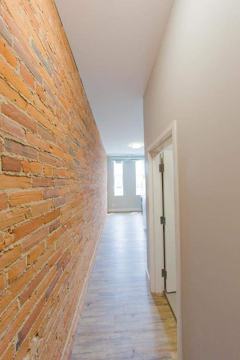 Ceiling heights of approximately 10 feet; Exposed-brick walls; Laminate flooring throughout the suites with the exception of bathrooms; Kitchens with custom designed cabinetry, engineered quartz countertop, backsplash, hood fan and stainless steel sink. Stainless steel appliances in all suites; Bathrooms feature porcelain floor tile, pedestal sinks, and wall tile in the shower. There are also custom designed window coverings.
