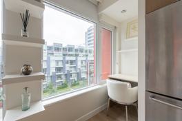 Welcome to Block 100 at Olympic Village! This is a bright and well-laid out FURNISHED Junior 1 bedroom with a den which can be used as a storage, walk-in closet or office space. A functional and open concept kitchen - featuring stainless steel appliances, fridge, built in oven, dishwasher, gas stove and lots of kitchen storage! Beautiful hardwood floors, in-suite high-efficiency washer and dryer and A/C!! Amenities included: a fully equipped fitness centre, bike storage and private rooftop resident lounges and visitor parking. This unit comes with 1 parking spot and ALL UTILITIES INCLUDED.