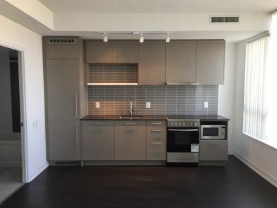Bachelor unit in open concept with Quartz Counter Top & Integrated Appliances @ 365 Church Condos by Menkes @ Church & Carlton