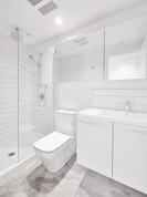 This stylish studio suite features soaring double-height ceilings and floor-to-ceiling windows that flood the space with natural light. The home showcases polished concrete flooring, top-of-the-line stainless steel appliances including a gas range, and in-suite laundry for ultimate convenience. The spacious bathroom is equipped with a rain shower, subway tile backsplash, and glass enclosure, creating a clean and modern spa-like feel.