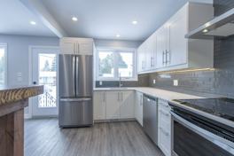 This main level 2 bedroom plus den apartment has just been completely renovated from top to bottom! The oversized den features stylish sliding barn doors and can be used as a third bedroom. Lots of natural light in this unit! Spacious living and dining area opens to the kitchen which has top of the line stainless steel appliances, movable island and plenty of storage space. In suite laundry and parking for 2 cars (maybe more)! Located on a quiet street near transit, close to highway access, shopping and restaurants. Large backyard backs onto a park. Available immediately. Tenant pays hydro.