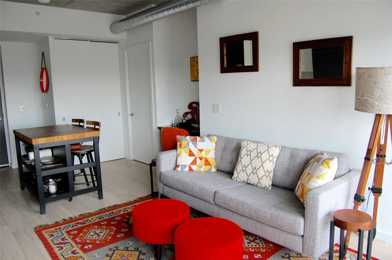 Move In The Brand New Winner Of Bild`s Best Design Award And Toronto Urban Design Award Condo. Excellent 1 Bedrm Unit 555Sq Ft. Balcony, Unobstructed View Of The City! Open Concept Floor Plan With High Exposed Concrete Ceilings, B/I Desk,Internet, Engineered Hardwood Floors, Stone Counter Tops B/I Appliances 2000Sq. Ft. Gym, Office Space, Hobby Rm, Kids Playrm, 24Hr Concierge, Guest Suite, Etc. Minutes From Dt Core, Ttc, Dvp, Parks, Restaurants & Shops.
