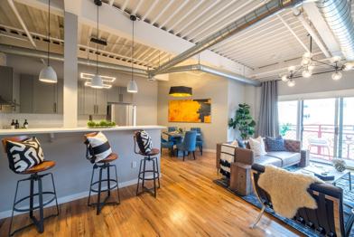 Contemporary, newly remodeled loft with high-end finishes and designer furnishings pictured--available fully furnished with all utilities and cable/internet included! This urban sanctuary boasts hardwood floors, open floor living, fabulous art, a private balcony, and includes a parking space in the heated garage and storage locker. The new kitchen has quartz countertops, stainless appliances, gas range with vent hood, breakfast bar seating, and comes furnished with all kitchenware. Modern lighting adorns the dining area and cozy living area. The master suite includes a large walk-in closet, bedroom skylight with remote-controlled shade, and gorgeous master bath. There is a powder room for guests.