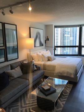 Gorgeous views of Lakeshore East park , the lake, and the river areas. Spacious Studio with updated kitchen and bathroom. 5 minute walk to Mariano's Grocery , dog park, dining and the pedway so in the winter skip the cold walk to work. Dogs and Cats okay! Meow Woof! Great Value for a beautiful building. Inquire about showings today!
