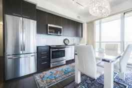 Large 2 + Den Corner Unit With Se Views Of Lake Ontario & Cn Tower. Huge 300Sf+ Wraparound Balcony, With 3 Walkouts. Walk, Jog, Cycle To Parks & Trails Off Lake Ontario. Minutes To Major Hwys, Ttc & Go Station. Panoramic Views From 46th Floor Gym & Party Room. Outdoor Infinity Pool With Cabanas, Fire Pits & Bbqs. Parking/Locker/Cable/Internet Included In Rent. Avail Furnished For $3,500/Mth.