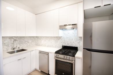 -Remodeled kitchen with mosaic backsplash, quartz countertops, glossy white soft-close cabinets, and brand new stainless steel appliances: gas range, hood, dishwasher, & refrigerator