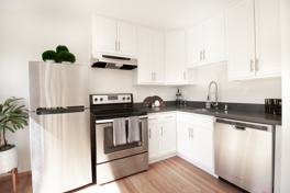-Newly remodeled kitchen with quartz counter tops and white cabinets